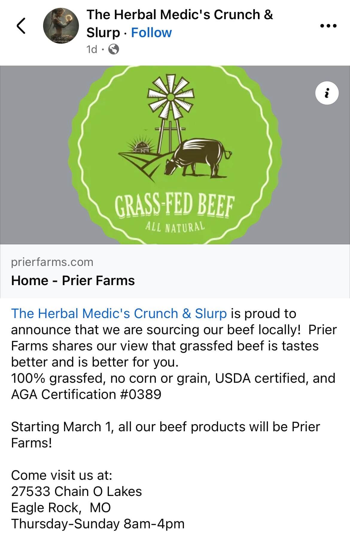 Prier Farms is a fourth generation farm established in the 1800's, now known as the American Grassfed Association certified farm #0389. Open to the public, we are a family business with a passion for delivering truly the best quality of product year after year. We have created a sustainable farm, raising our own hay for seasonal feeding as we use NO grain or corn and deliver USDA certified 100% grass-fed beef. We also raise our own replacement heifers for breeding and replenishing the herd. We purchase bulls for breeding as needed and currently have five Angus/Limo crossbreeds. Our meat is processed in a USDA approved processing plant in Fair Grove, MO. We would love to hear your story and how our passion for healthy and delicious beef fits in with your passion for delivering quality to your family!